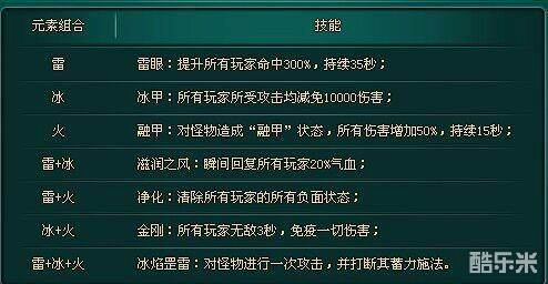PS:技能只能由混沌元素的玩家使用;需要多个元素组合的技能,只要相应属性玩家站在元素激发开关附近,其中一个号采集就可以了,不需要一起采集;所以不是需要的元素玩家要离元素激发开关远点,以免采出来的技能不是需要的。