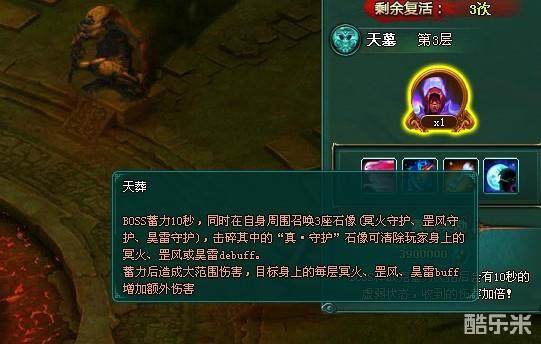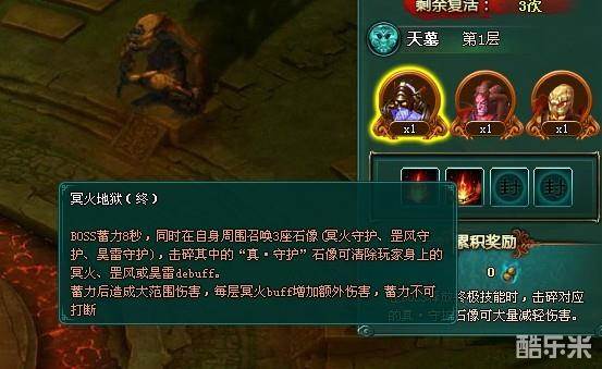 不多说挂机。BOSS招石像的时候就丢大群(6~7万站的盆友大群秒不掉的话可以大群加无双暴走)切记石像一定要打掉不然就等着被秒吧。第一层只要注意打掉石像就能过了。