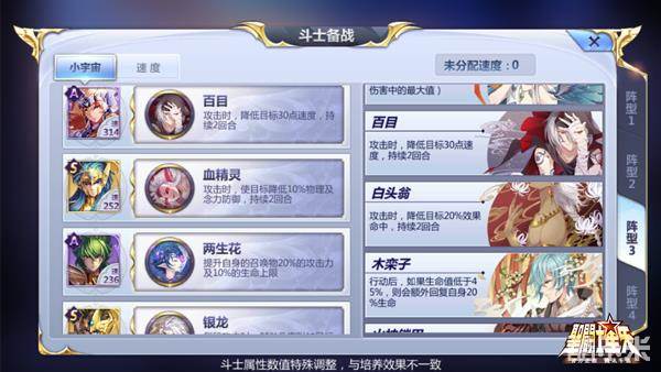 由于斗士之间的联动性极高,所以小宇宙搭配这块非常有讲究:瑠奈作为核心辅助提高生存能力是关键!个人推荐配带“火神铠甲”确保前期不会被集火秒掉;贵鬼则搭载“水泽精灵”获取额外能量供团队使用;而艾欧里亚这位输出主力当然选择“银龙”这个多段增伤型小宇宙。
