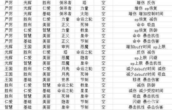 下面给大家展示能激活两种属性和三种属性的组合情况。