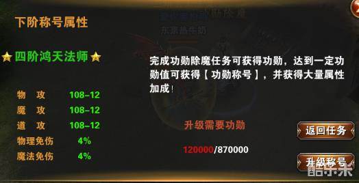 功勋值可以用来领取功勋称号,功勋称号可以不断升级,称号等级越高,给予的属性值提升越高。所以每天一定要记得做功勋除魔任务哦!