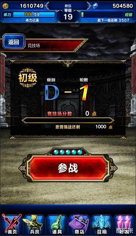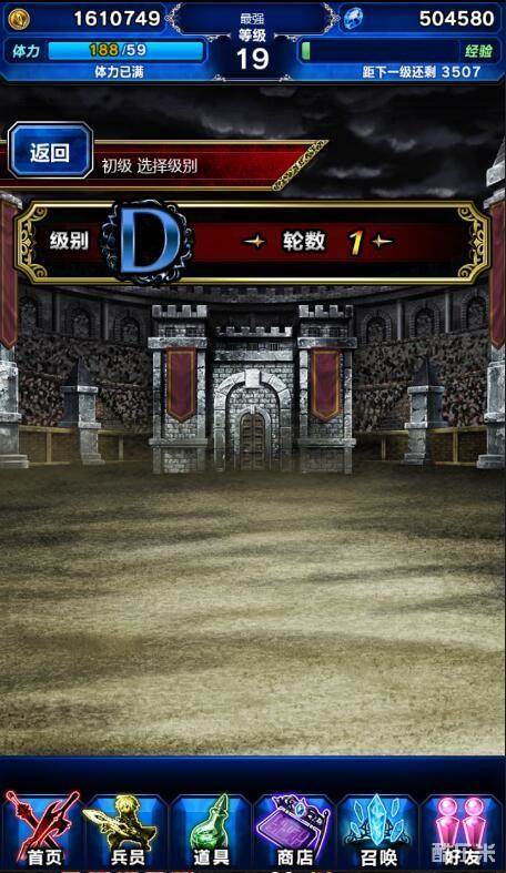 魔物讨伐战(竞技场)按照级别进行排序,初级<中级<上级…随着级别的提升,挑战的难度逐步增加,每一个级别按照D<C<B<A<S五个档位进行划分,而每一个档位又分为1<2<3<4<5,5个轮数,每1个轮数每位队长需要挑战10场,并取得全部胜利后,方可进入到下一个轮次中。