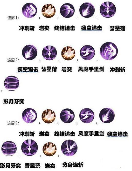 【彗星落】加满、【疾空追击】加满、【冲刺斩】1级、【终结追击】加满、【分身连斩】加满、【影月牙突】加满