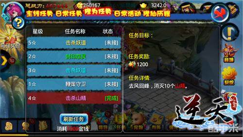 《逆天仙魔录》设有“修为任务”,以供仙友们每日获得修为。修为任务共分五个星级,完成任务,从低到高可依次获得150、200、600、1200、2400个修为经验。消耗金钱可刷新修为任务星级。接受任务后,仙友们可以选择马上完成,会得到相应修为奖励,也可选择元宝翻倍,采用元宝翻倍后,需要消耗少量元宝,任务直接自动完成,省去了打怪时间,同时修为值翻倍。执行星级高的修为任务时,采用元宝翻倍的性价比更高。