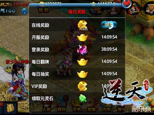 登陆游戏后,首先攻占眼球的一定是屏幕左侧那个金晃晃的大钱包,提醒玩家又到了收获的季节。点之可领取每日奖励,不论级别高低能力大小,这是属于每个人的福利。每日奖励包含七项:“在线奖励”、“开服奖励”、“登陆奖励”、“每日翻牌”、“每日抽奖”、“VIP奖励”、“领取元灵石”。“在线奖励”可以反复提取,经过短暂的CD等待,每次都能收获更多金钱。“每日翻牌”要依据玩家登陆游戏的频率发放奖励,每日登陆翻牌次数加1,中断连续登陆翻牌次数减2。