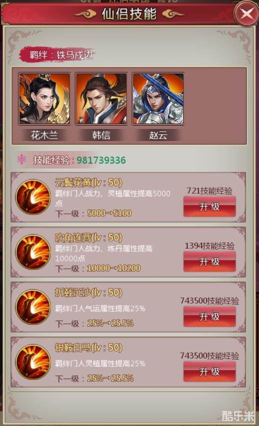 之前已经提到过迎娶仙侣解锁羁绊, 每个美人都有自己的【羁绊组合】和对应的【门人】。技能开启需要亲密度达到相应的解锁条件。通过消耗技能经验升级技能,增加门人的属性从而提高势力。这也是提高势力的一个重要途径。