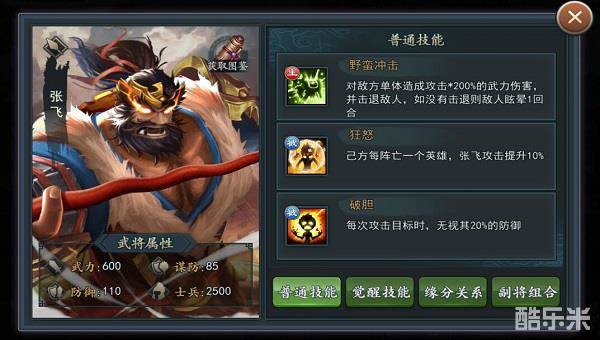 被人称为万人敌的张飞他在游戏中也不容小视,野蛮冲撞对敌方单体造成200%的武力伤害,并击退敌人,如果没有击退则会晕眩1回合。狂怒,每当己方阵亡一个英雄就可以增加10%伤害。和张飞对阵会让敌方压力增大,让张飞每次攻击可以无视掉敌方20%的防御。