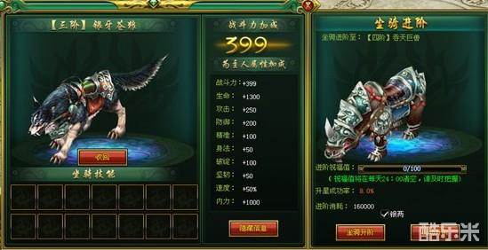 坐骑升级相当简单:打开坐骑界面,点击进阶按钮即可进行升阶,玩家可全程使用银两进行坐骑进阶,当然也可以使用元宝进阶喔。