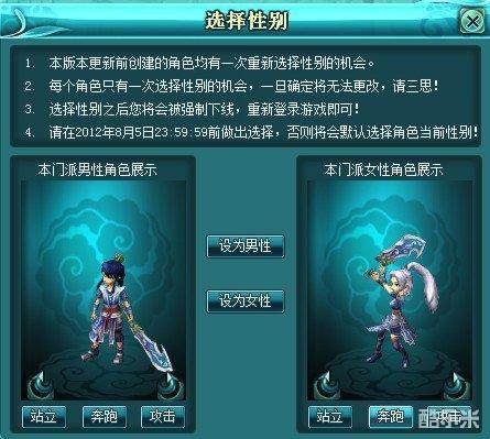 六大门派分别增加了对应的男女主角角色,并提供给全体玩家一次选择性别的机会。具体规则如下: