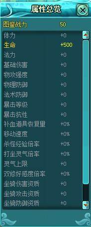 图鉴总览界面列出所有图鉴被激活后可获得的全部属性。