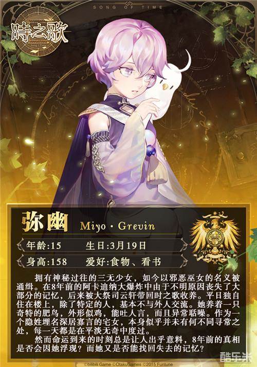 拥有神秘过往的三无少女,如今以邪恶巫女的名义被通缉。在8年前的阿卡迪纳大爆炸中由于不明原因丧失了大部分的记忆,后来被大祭司云轩带回时之歌收养。平日独自住在楼上,除了特定的人,基本不与外人交流。她养着一只奇特的肥鸟,外形似鸡,能吐人言,而且异常聒噪。作为一个隐姓埋名深居寡言的宅女,本身似乎并未有何不同寻常之处,每一天都是在平淡无奇中度过。然而命运到来的时刻总是让人出乎意料,8年前的真相是否会因她浮现?而她又是否能找回失去的记忆?