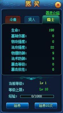 玩家消耗灵石可对昆仑镜进行器灵培养,培养会分为三个分成:pvp 型的斗者、均衡型的贤人、PVE型的隐士