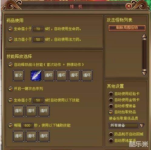点击小地图旁的挂机按钮,或用Shift+H打开挂机设置界面。而平时玩家在游戏主界面上按“h”键,即按照上次保存的挂机设置进行自动打怪。挂机设置界面入口: