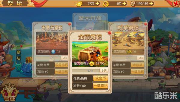 在祭坛系统中,分为金币祭祀,粮草祭祀、及天命石祭祀,每种祭祀可获得对应的资源,在玩家资源不足时,可通过祭祀获得额外资源。