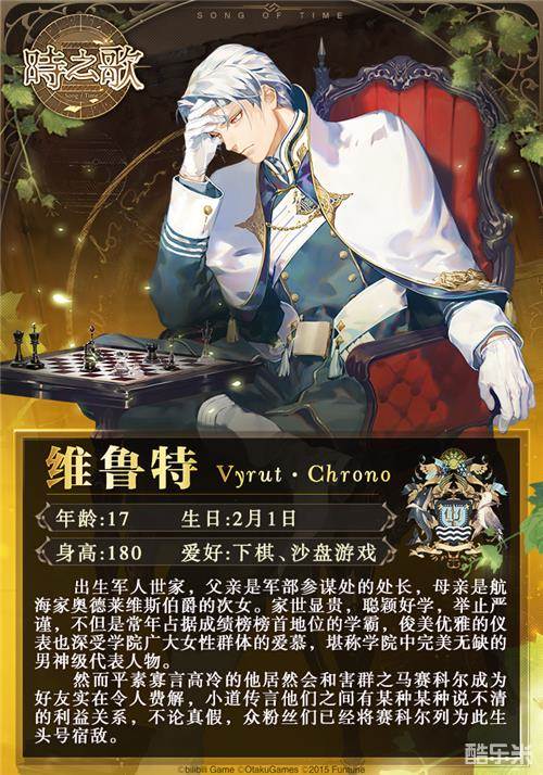 出生军人世家,父亲是军部参谋处的处长,母亲是航海家奥德莱维斯伯爵的次女。家世显贵,聪颖好学,举止严谨,不但是常年占据成绩榜榜首地位的学霸,俊美优雅的仪表也深受学院广大女性群体的爱慕,堪称学院中完美无缺的男神级代表人物。然而平素寡言高冷的他居然会和害群之马赛科尔成为好友实在令人费解,小道传言他们之间有某种某种说不清的利益关系,不论真假,众粉丝们已经将赛科尔列为此生头号宿敌。