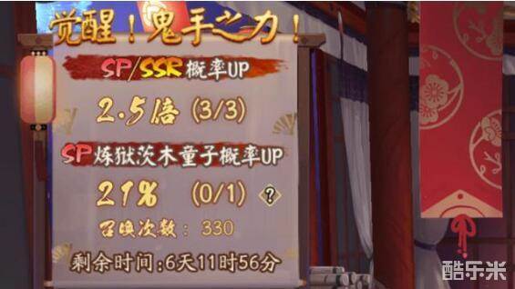 本次SP茨木的登场附带的SP/SSR概率UP活动,次数一共有三次,基本上100蓝票左右就能搞定的程度,对于全图鉴玩家来说会有额外的15%的定向UP,然而因为SP茨木童子是第二个SP稀有度的式神,在基数增加的基础上,该式神的获取难度无疑比小天狗还要高很多,虽然有50抽额外增加1%几率的设定,但实际体感真的不好。