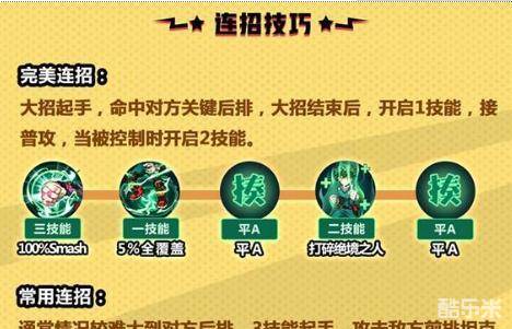 常用连招:通常情况较难大到对方后排,3技能起手,攻击敌方前排坦克依靠血量百分比对敌方造成伤害,大招结束,开启2技能离开战场,若没有被集火开启1技能站撸对方最近单位。