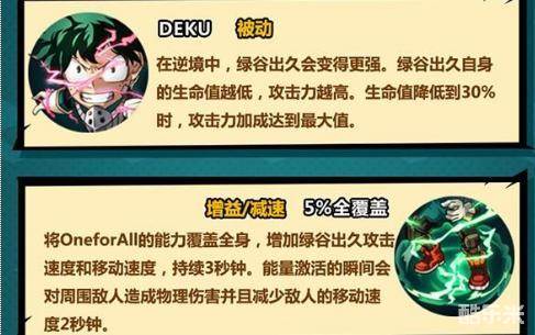 1.绿谷出久拥有较高的上手难度,看似简单的连招,但对于释放时机和技巧都有不小的挑战。大招可以配合瞬身玉,起到意想不到的效果,尽可能配合队友在前期打出优势。