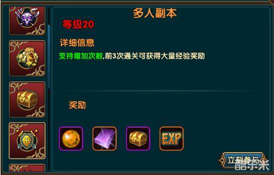 多人副本为游戏中难度最大的副本。并掉落较好的装备。多人副本每天限时开放。除少数实力超强的玩家,建议组战士一起进入,可大大缓解受伤压力。