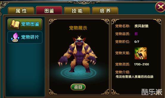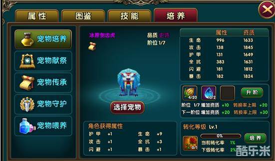 第二大栏其实是宠物系统里面最重要的一个部分。首先我们先说说洗髓功能,这个是改变宠物属性的,比如说疾风豺狼是一个强攻宠物,那么洗髓的时候肯定是往攻击和暴击方面洗,洗完之后选择替换就可以了。至于培养就是培养宠物的各项属性,不过这个肯定是有增无减的,当然相对洗髓来说肯定会贵一点。最后升阶是提高宠物的资质,跟+1、+2的感觉差不多。