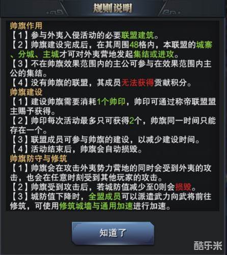 准备进攻外夷营地之前,区服内称帝盟的盟主需要进行帅印的授予,获得帅印的联盟盟主可在距离外夷大营6格子外建设联盟建筑-帅旗。只有帅旗周围48个格子内的城寨、分城、主城才可对外夷营地发起进攻与集结。同时,不在帅旗范围内的主公可以加入在范围内主公的集结以参与活动。要注意的是,没有帅旗的联盟所属成员是无法获得贡献积分的,所以联盟的盟主可踊跃向称帝盟盟主请命,拿取帅印,集结大军讨伐夷狄。