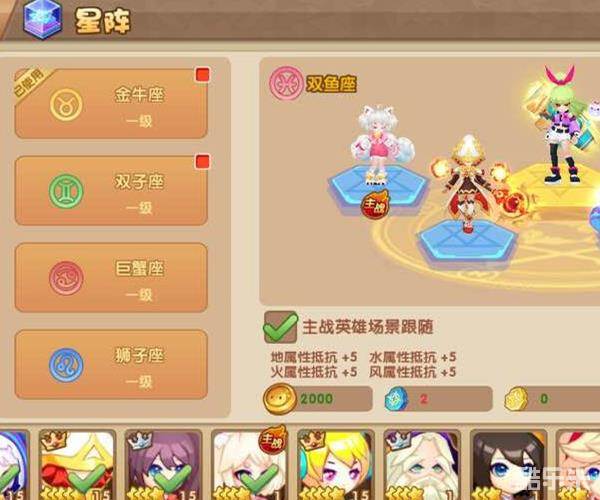 选择阵法要看好自己阵容特点再选择(推荐:巨蟹座/射手座,增加速度和魔法/物理攻击),座位主升,其他的条件润许可以选择升级,不一定要都满。