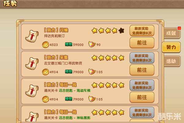 任务这块的资源主要分成三块:成就、势力和活动。成就这块不用特别关注,反正在打怪升级的过程中就慢慢完成了。活动也是每日必做的,主要产出经验和金币,是英雄升级的最大资源库。势力的奖励则是分星级的,每天有七次免费刷星机会,星级越高获得的资源就越多。大家每天在开始游戏之前别忘了去刷新下势力任务的星级,这样才能最大限度拿到资源,强化自己。