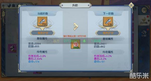 可强化装备,可以通过强化和进阶提高装备属性,强化需要消耗专属道具,每阶强化至11级即可升阶,升阶后战力成吨增长。