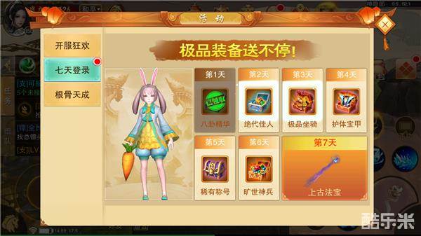 1.开服后前七天有开服狂欢活动,玩家通过战力、等级和各种排行榜获得与自己实力对应的道具奖励。