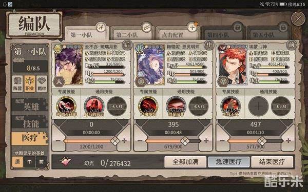 英雄在与敌人交战的时候难免会受伤,那么英雄的医疗也是必不可少的哦。当英雄受伤时,引导者可以在队伍里使用幻光进行医疗,当科技“医疗术”满级时,即可开启急速医疗(消耗40体力快速完成治疗)。