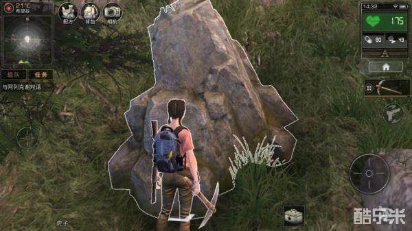装备镐头后,四处寻找会描边的石头,游戏中可以挖的石头分很多种,没有固定外形(没有装备镐头的时候,或者这个石头不能挖,是不会出现描边提示)。