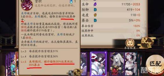 所以实战中你会发现一反木绵这个式神的特色在于看似是控制但实际却不需要堆命中,靠偷属性就能满足她的控制需求,在养成程度上会大幅度降低成本,对于控制式神有极好的克制效果和针对能力。而且暴击也不用堆满暴,65%就够用,直接偷对面输出的暴击,不但提高了自身输出还能保证我方式神的安全。且可以把更多的属性放到爆伤上做文章。
