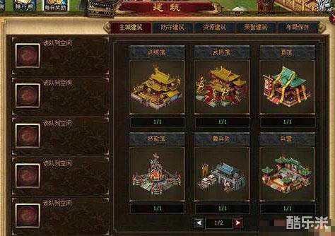 主城建筑:训练馆、武将馆、酒馆、技能馆、募兵处、兵营、铁匠铺、天坛、研究院