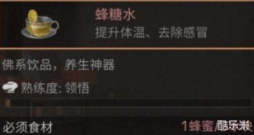在游戏中,蜂糖水也是很重要的食物,不仅可以填饱肚子,还可以提升自身体温并去除感冒,在恶劣环境中的作用相当大,可以极大地提升自身自保能力和战斗力。