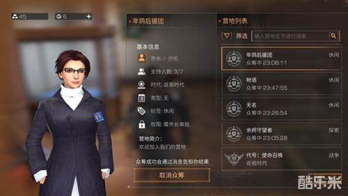 内有营地管理台(营地升级,查询贡献,管理权限), 科技研发台(捐献科技点,营地科技更换)和交易之城, 领土任务开发,占领资源地图开发,职业专职,出售食材