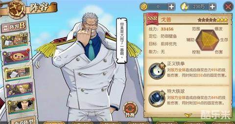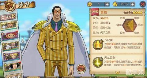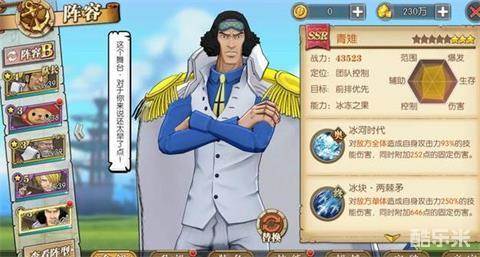 最后再给大家看下SSR的几个伙伴,这里给大家推荐一下,三大海军大将优先选择,黄猿,赤犬作为输出的核心位置,优先选择,如果都有的话在考虑青雉,艾尼路看大家自己的喜好,艾斯系统会送大家,所以三大海军大将是优选的!