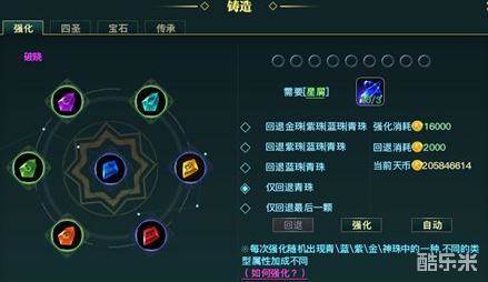 游戏的强化系统好处就是强化不会失败只会成功,而强化成功会随机出现五色珠中的一个,质量越好的等级珠出现的几率也就越低。