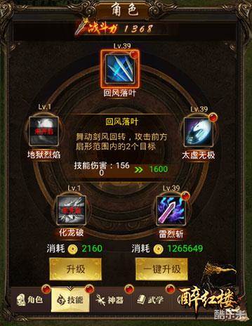 技能包括回风落叶、地狱烈焰、太虚无极、化龙破和雷烈斩。回风落叶,舞动剑风回转,攻击前方扇形范围内的2个目标;地狱烈焰,从脚下爆炸出地狱烈焰对周围1个目标造成伤害;太虚无极,幻化出2把太极剑,攻击锁定范围内的2个目标;化龙破,神龙降临对飞过范围内的1个目标造成伤害;雷烈斩,凝聚雷之力召唤落雷,攻击周围随机2个目标。技能最始等级为1,玩家可通过消耗金币进行升级。