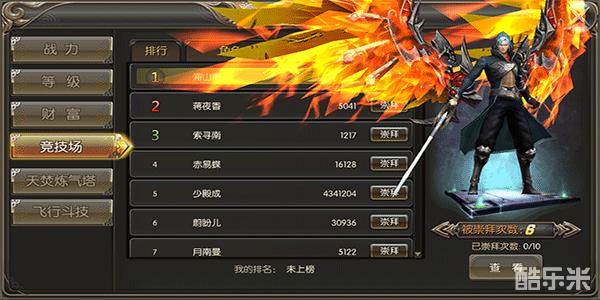 竞技场界面中,显示了靠近自身排名的玩家,下方很明确地显现出战力对比。每个人每天有十次挑战次数,一旦点击就会进入格斗场开始格斗。