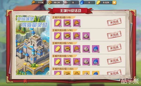 王城升级活动永久开启,每达到目标王城等级即可获得升级奖励。海量金币尽在其中,不要忘记领取哦!