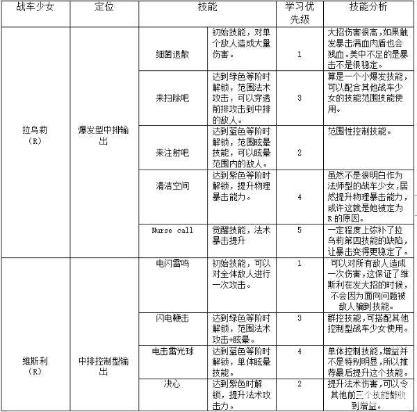 以下对于目前能获取到的智力型战车少女技能的分析,可以用来作参考,将会随后时间进行更新,实际上战车少女技能提升方式还需要根据队伍的配置来定。不同的阵容,战车少女在技能搭配方面会有多种方式。