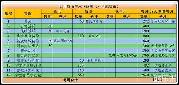从表中我们可以看到,玩家A每月可以获得的钻石在12000左右。而且这里的计算都相对保守,实际产出一般还会比这个数字更高一些。