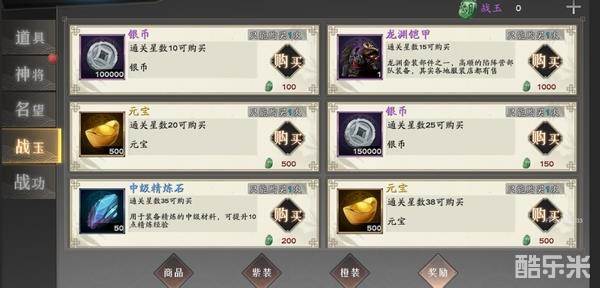 战玉的产出需要在围城之战中通过击败各层的将领后获得,获得的战玉可以用来换取武将所穿的装备,游戏中的所有装备均可在此兑换!
