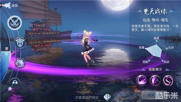 很意外,游戏只有三个职业:荒古圣体、先天道体、梵天战体,职业属性分别就是战士、法师与刺客的配置,相较于市面上流行的多职业风气,有点简单粗暴,但是我喜欢,嘿嘿。选角界面是动态的,这点和市面上的游戏区别不大。一向喜欢玩灵巧型的职业,自然选择了梵天战体,选性别时在小正太与小萝莉之间纠结了好久,最后还是选了小萝莉,因为偶是萝莉控哟!嘻嘻!