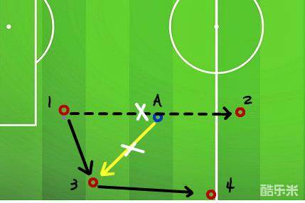 首先,队员A没有去上抢队员1也没有跑向边路队员3,而是先使用准则⑴将队员1和队员2隔开切断这两人的传球路线,如果我们跑向边路队员3身后会有大片空挡,队员2接球后会去组织进攻,非常危险,千万不要给对手空间。