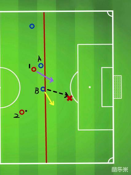 看这条红色实线,一般这种情况部分人可能会看到我的教程或者依据自己的经验沿着黑色虚线跑位防守,其实大可不必这样,因为如此一来便破坏了最佳阵型,在你后退的同时对手已经快进入射门范围。你应该最先想到准则⑴,先用队员B将持球队员2与球门隔开站在最佳防守位置,然后跑黄色箭头线路收住内线保持最佳阵型,不让队员2直塞或者传球给插上的队员1,并且延缓对手。
