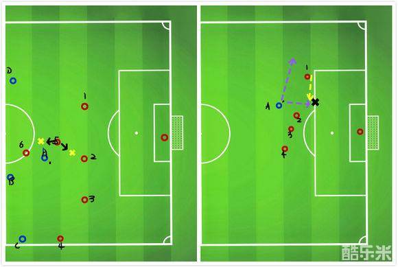 队员1这时候由于离队员2太远已经不再是最佳队形,如果我们用队员2去防守那么意味着队员1、3、4全部是摆设完全帮不上忙,而持球队员A就形成了与防守队员2的1V1。如果对方是C罗、本泽马、格子优秀的前锋,恐怕我们就会凶多吉少了。怎么办呢?很简单,我们只需要用队员1按黄色虚线跑位禁止持球队员A向内走,在视频中,由于我们及时用队员1收住了内线,持球队员A沿着左边路紫色虚线带球,使持球A通往边路,危险性也就实质性的大大减小。