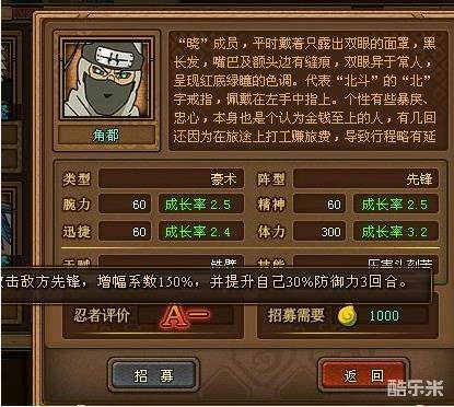 单独看角都似乎不像是先锋型的,他的技能如此防御流应该是砂之守鹤(号称最强防御是不是?)不过言归正传,不要被他A-的品质属性所迷惑,也不要因此小瞧了他,他注重的是内在涵养。我敢说,角都是一个非常经得起琢磨的男人,无论是游戏还是漫画。