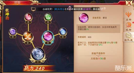 《战国之道》游戏中,玩家创建角色进入游戏之后即默认开启技能系统,技能分为主动技能、被动技能、组队技能三种。