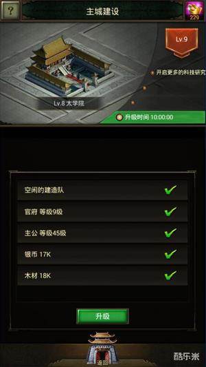 正所谓“官官相扣”,主公的等级跟内城官府挂钩,而太学院的等级也跟官府紧密相连。所以当官府提升等级时,必将影响其它建筑的提升建造。而建筑方面的升级,如果主公白天有时间挂机,也可以优先建造。因为所有建筑均为等级越高升级时长越多,所以没必要浪费白天做其它任务的时间来完成这个耗费时间的建筑升级。